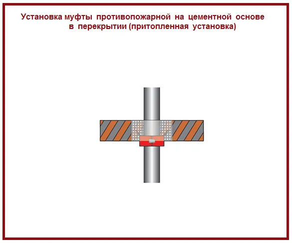 - На перекрытии (потолок/пол): Устанавливается одна муфта на проходку. Важно: она монтируется с нижней стороны перекрытия (на потолок нижнего помещения), так как огонь и тепловой поток стремятся вверх.