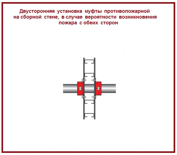 - На стене/перегородке: Устанавливаются две муфты — по одной с каждой стороны стены. Огонь может прийти из любого помещения.
