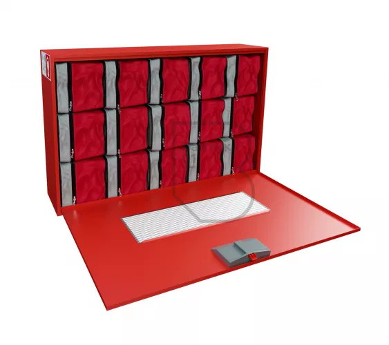Контейнер для самоспасателей ГДЗК-15 предназначен для удобства размещения, хранения и оперативной выдачи пятнадцати газодымозащитных комплектов ГДЗК. Допускается размещение в контейнерах специальных огнезащитных накидок (СОН) и медицинских бескаркасных огнестойких накидок (НМБО).