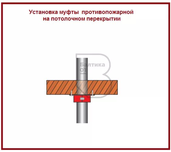Противопожарная муфта «БАЛТИКА ПМ» 80 – предназначена для препятствия распространения пожара через места прохода труб из поливинилхлорида, полиэтилена, полипропилена сквозь перегородки и межэтажные перекрытия. В случае возникновения пожара, под воздействием высоких температур муфта противопожарная срабатывает и перекрывает отверстие в перекрытии (стене) с нормированной степенью огнестойкости до EI-150.