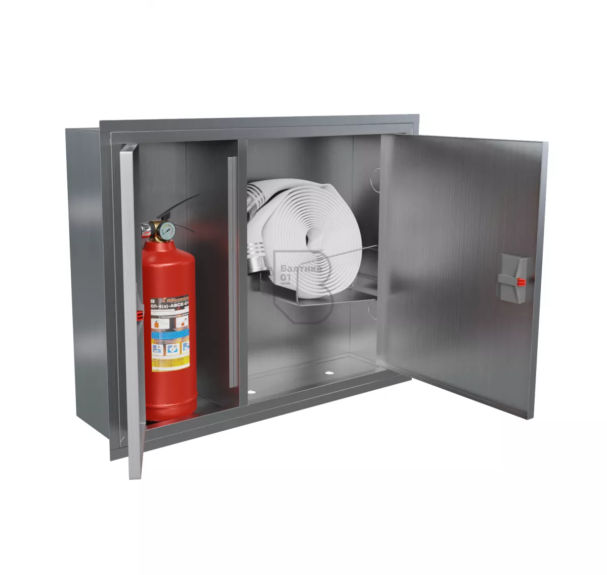 Дверцы пожарного шкафа открываются на 160 градусов. Имеют запорное устройство в виде пластиковой защелки.