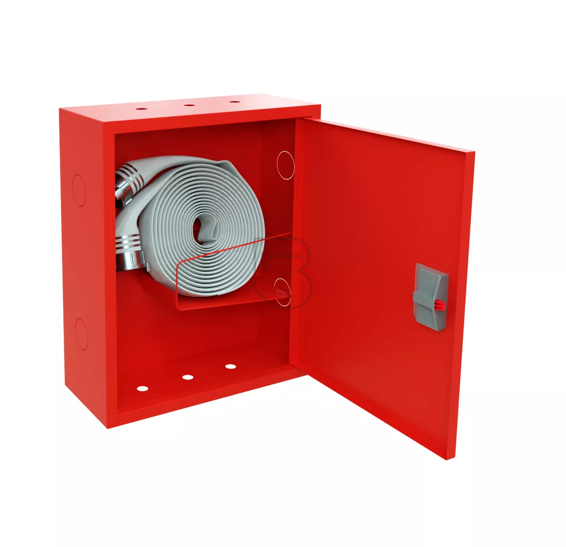 Дверца пожарного шкафа открывается на 160 градусов. Имеет запорное устройство в виде пластиковой защелки.