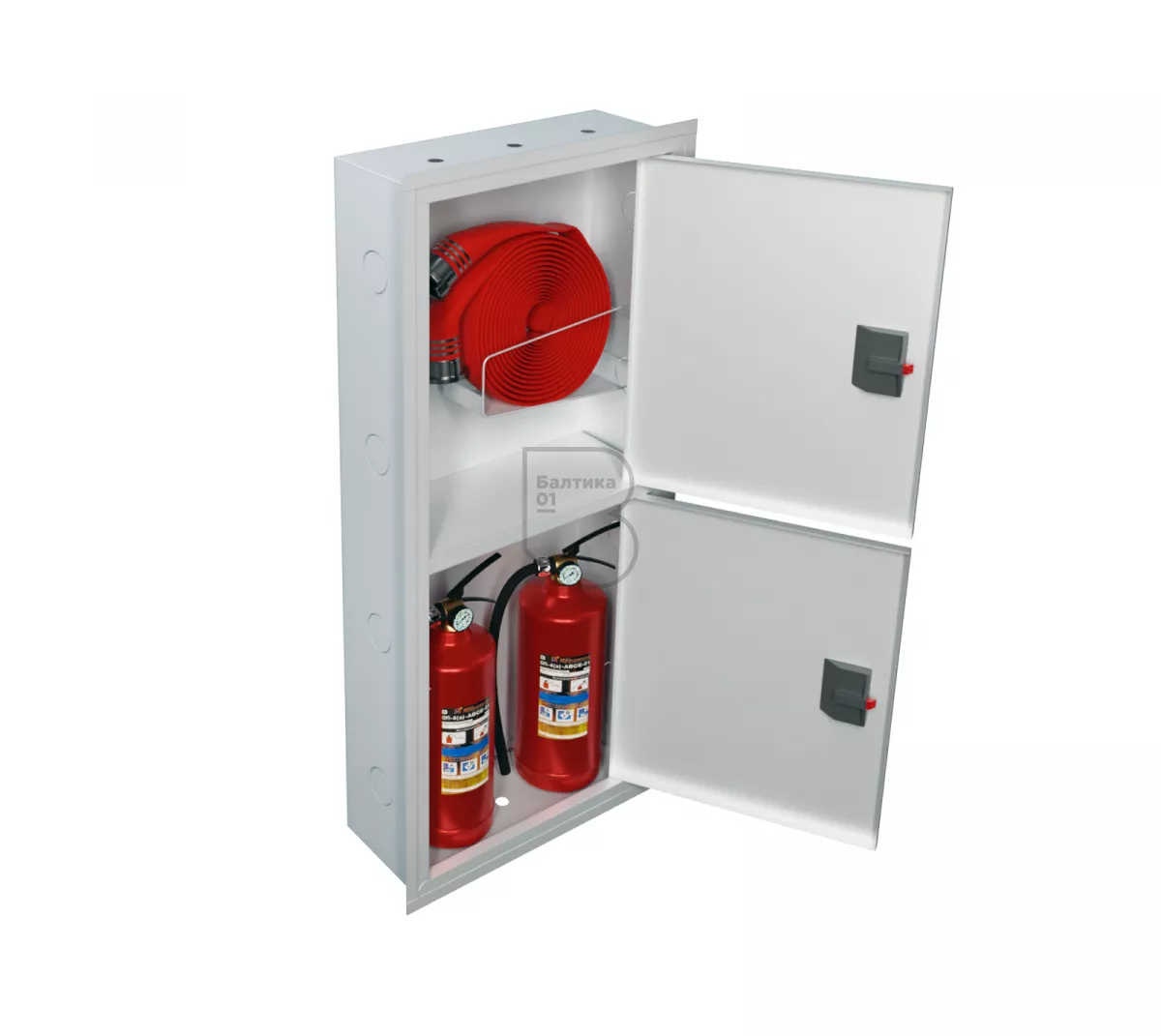 Дверцы пожарного шкафа открываются на 160 градусов. Имеют запорное устройство в виде пластиковой защелки.