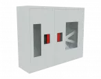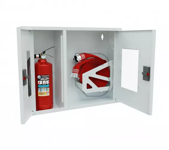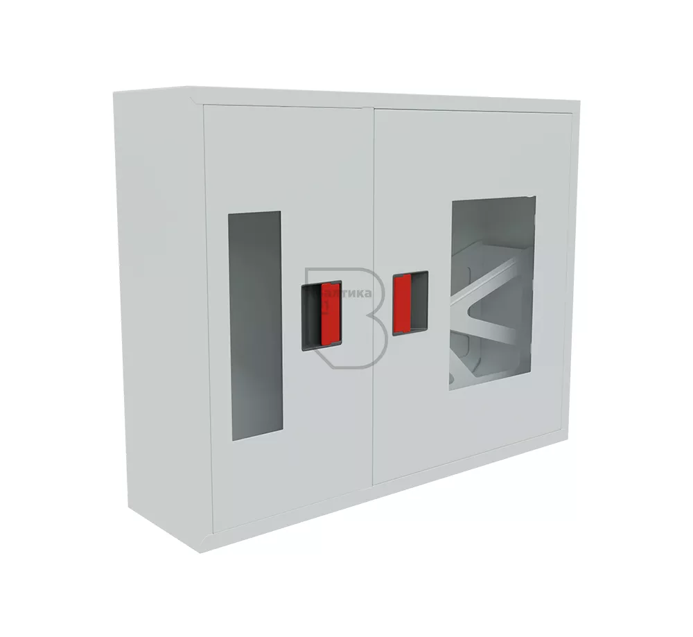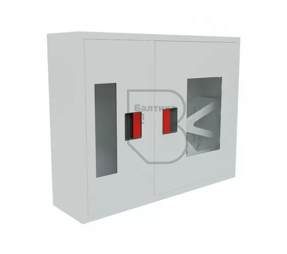Дверца пожарного шкафа открывается на 160 градусов, открывание двери универсальное (правое и левое). Дверца имеет дополнительные загибы для усиления жесткости конструкции. На двери и корпусе шкафа предусмотрены отверстия для опломбирования шкафа. Дверь пожарного шкафа имеет запорное устройство в виде пластиковой защелки. Дверь закреплена с помощью монтажного штифта, при необходимости она может быть снята в результате простого нажатия на кнопку штифта. На каждой дверце имеется смотровое окно со вставкой из стекла.