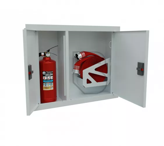 Дверца пожарного шкафа открывается на 160 градусов, открывание двери универсальное (правое и левое). Дверца имеет дополнительные загибы для усиления жесткости конструкции. На двери и корпусе шкафа предусмотрены отверстия для опломбирования шкафа. Дверь пожарного шкафа имеет запорное устройство в виде пластиковой защелки. Дверь закреплена с помощью монтажного штифта, при необходимости она может быть снята в результате простого нажатия на кнопку штифта.