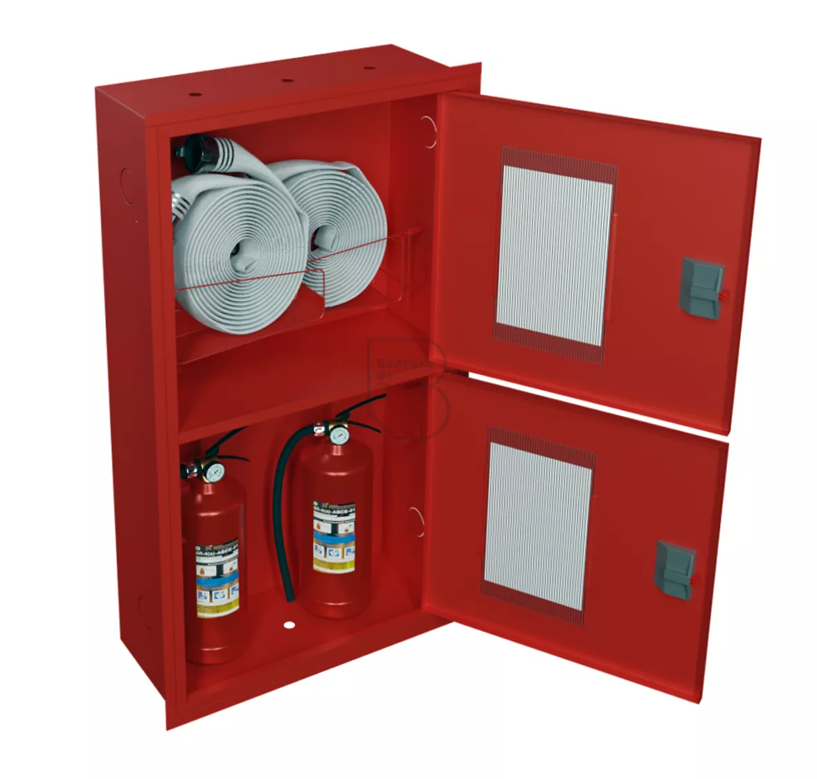 По типу монтажа – встраиваемый, по наличию смотрового окна на дверцах шкафа – открытый, по цвету изделия – красный (RAL 3000).