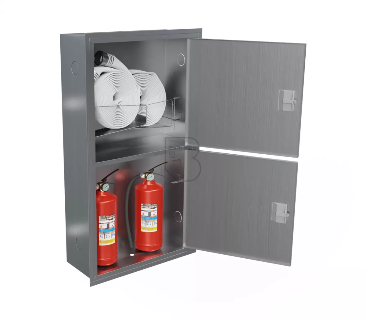 Шкаф пожарный ШПК-320-12 ВЗ из нержавеющей стали – предназначен для размещения и хранения двух рукавов пожарных в сборе, двух пожарных вентилей (клапанов) и двух огнетушителей до 10 кг. Шкаф оборудован двумя кассетами рукавными (в верхнем отсеке шкафа размещаются две кассеты).