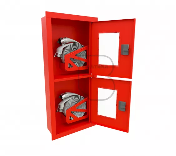 Дверца пожарного шкафа открывается на 160 градусов, открывание двери универсальное (правое и левое). Дверца имеет дополнительные загибы для усиления жесткости конструкции. На двери и корпусе шкафа предусмотрены отверстия для опломбирования шкафа. Дверь пожарного шкафа имеет запорное устройство в виде пластиковой защелки. Дверь закреплена с помощью монтажного штифта, при необходимости она может быть снята в результате простого нажатия на кнопку штифта. На каждой дверце имеется смотровое окно со вставкой из стекла.