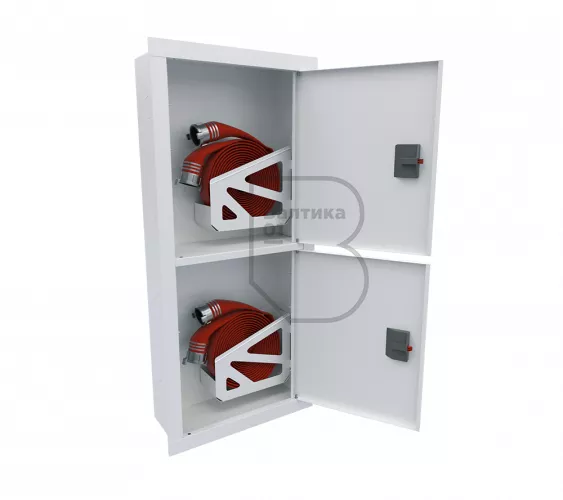 Дверца пожарного шкафа открывается на 160 градусов, открывание двери универсальное (правое и левое). Дверца имеет дополнительные загибы для усиления жесткости конструкции. На двери и корпусе шкафа предусмотрены отверстия для опломбирования шкафа. Дверь пожарного шкафа имеет запорное устройство в виде пластиковой защелки. Дверь закреплена с помощью монтажного штифта, при необходимости она может быть снята в результате простого нажатия на кнопку штифта.