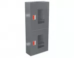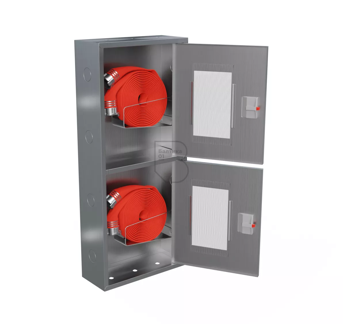 Дверцы пожарного шкафа открываются на 160 градусов. Имеют запорное устройство в виде пластиковой защелки.