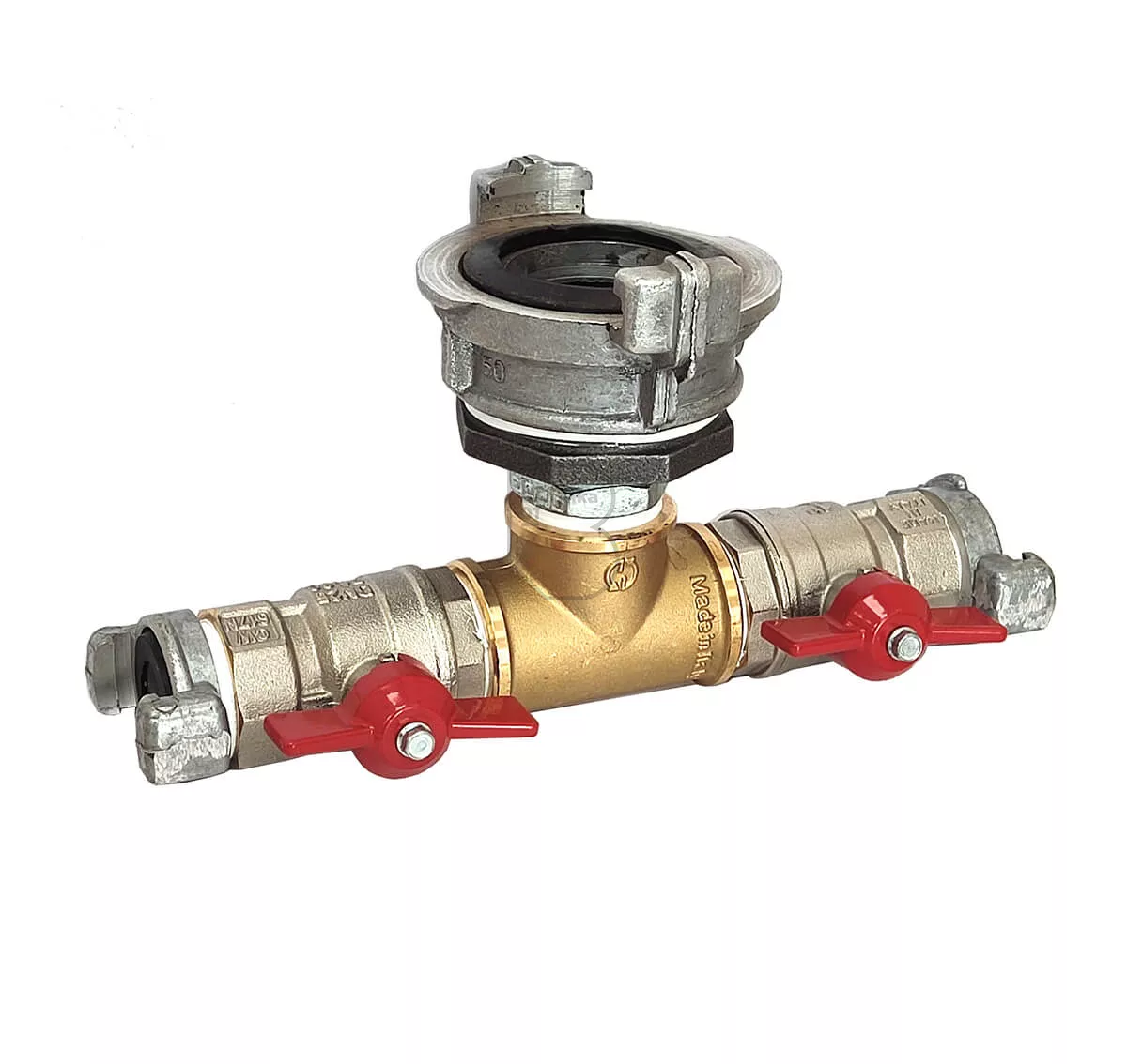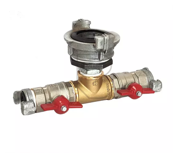 Поток жидкости со входа 50 мм разделяется на два выхода по 25 мм, каждый из которых оснащается перекрывным краном.